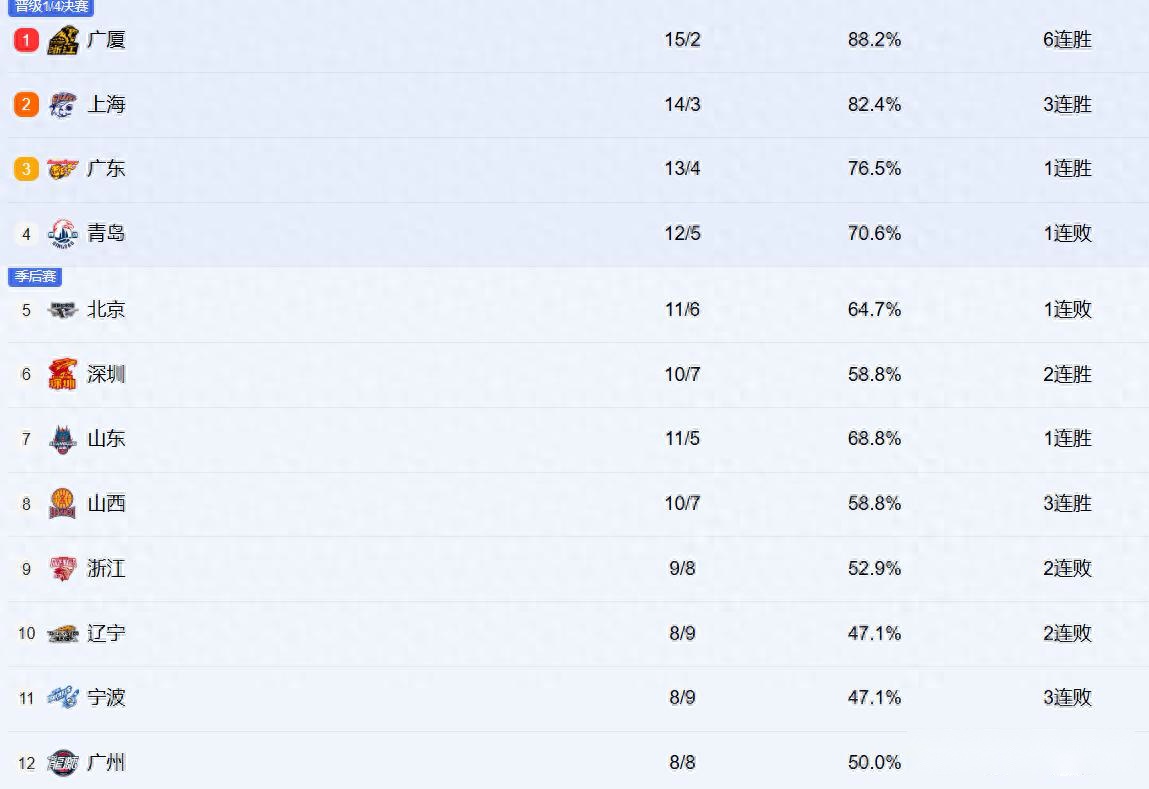 CBA最新排名!上海紧咬广厦居前2,辽宁跌至第十,新疆有望觉醒!