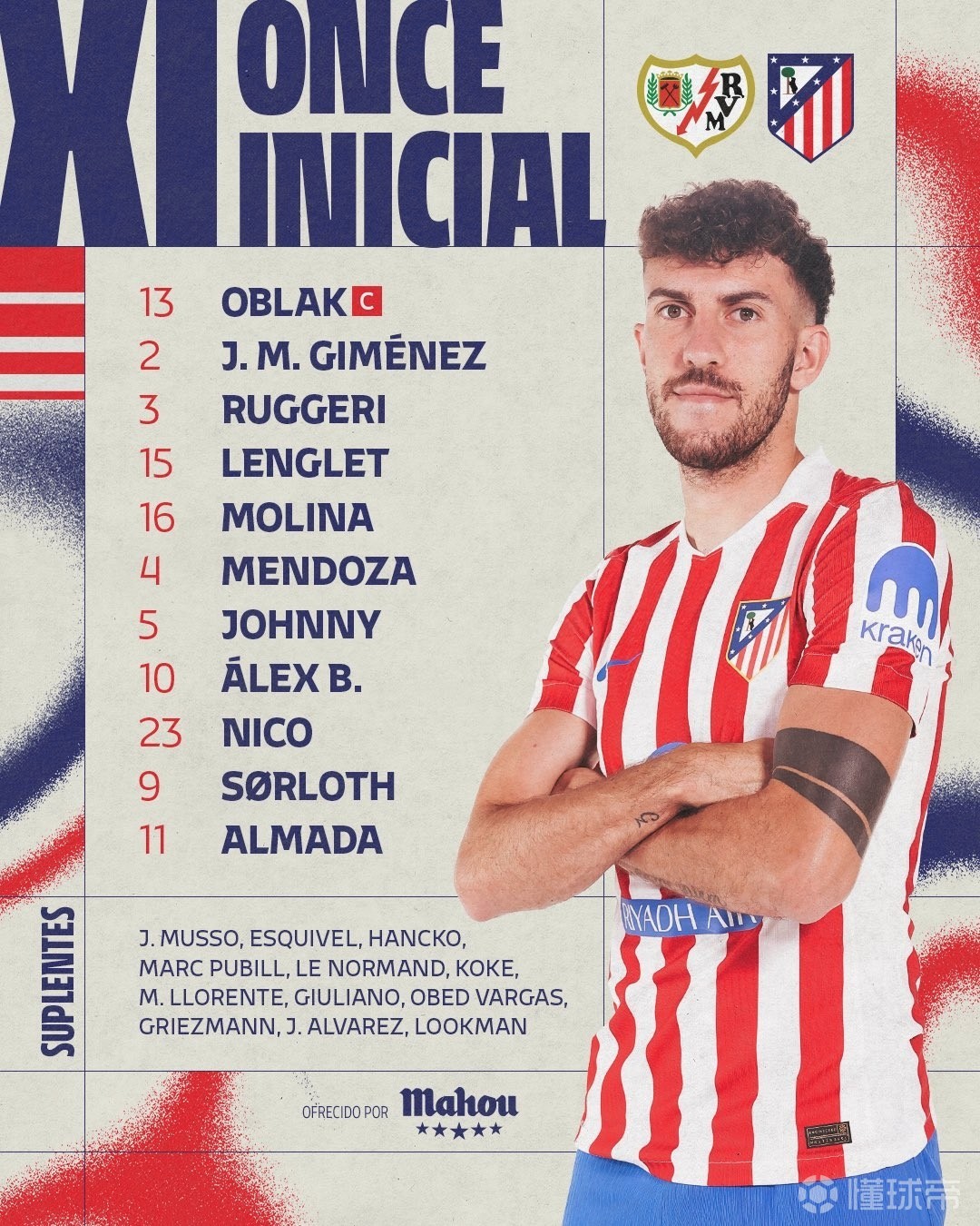 马德里竞技首发:13-奥布拉克、2-希门尼斯、3-鲁杰里、15-朗格莱、16-莫利纳、4-门多萨、5-卡多佐、10-巴埃纳、23-尼古拉斯-冈萨雷斯、9-瑟洛特、11-阿尔马达