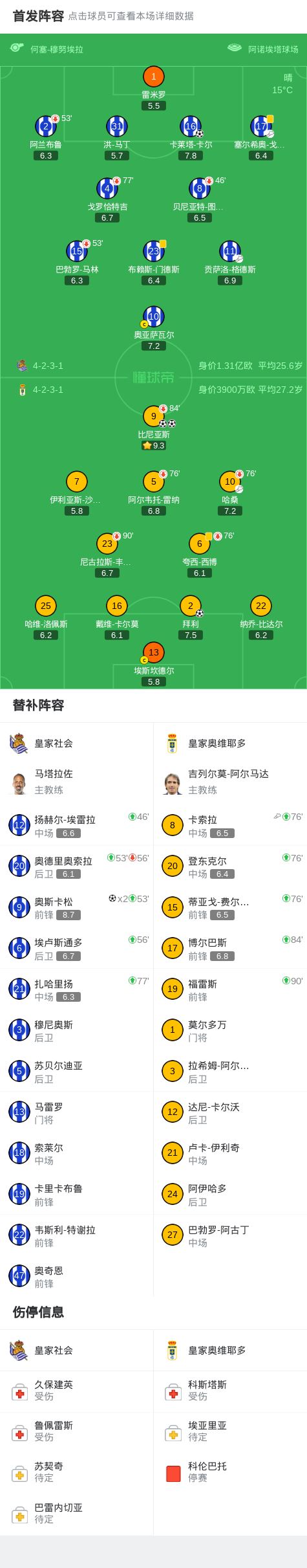 北京时间2月21日西班牙足球甲级联赛 联赛 第25轮,皇家社会主场对阵皇家奥维耶多。皇家社会奥斯卡松梅开二度,卡莱塔-卡尔破门。皇家奥维耶多比尼亚斯梅开二度,拜利破门。最终比分皇家社会 3-3 皇家奥维耶多。