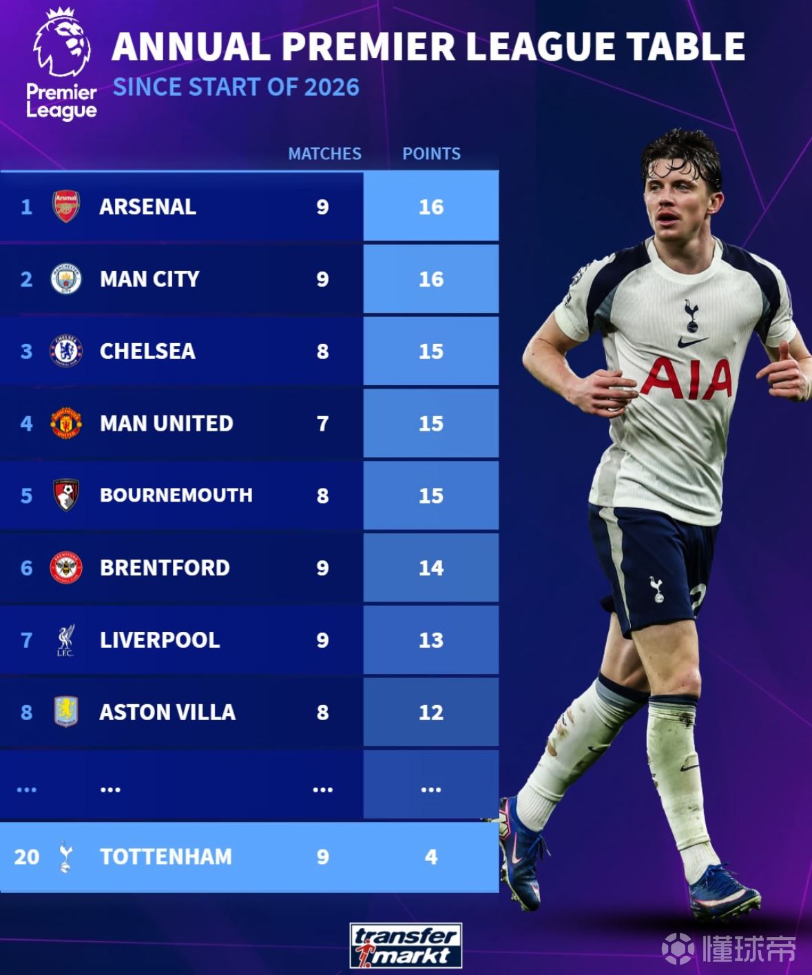 2026年,英超联赛的得分排行榜:(令人震惊的是,热刺竟然是垫底的!)