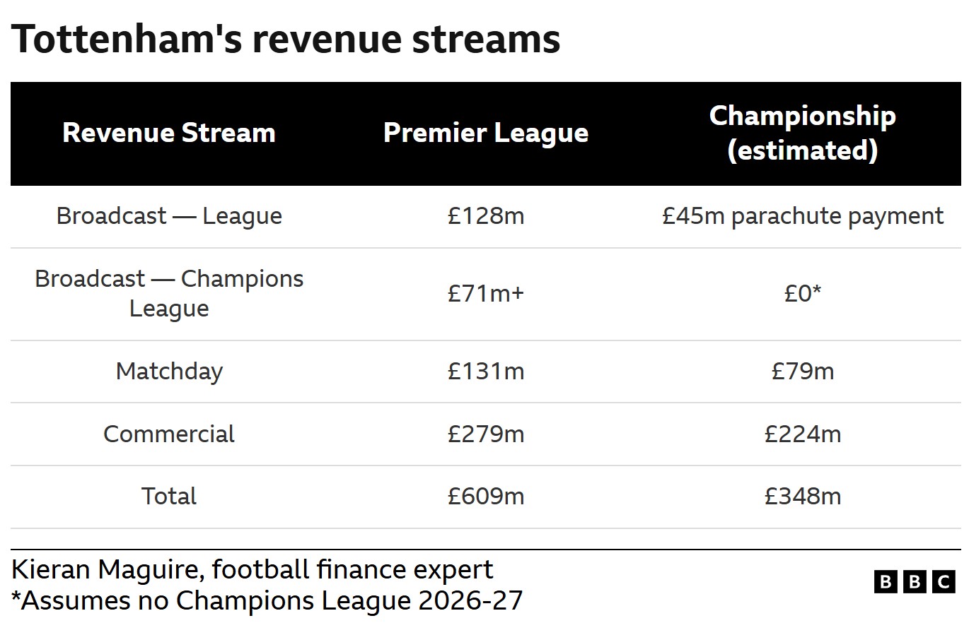 此外,转播收入也将暴跌。热刺将不再享有英超巨额的国内与海外转播分成,要知道,上赛季仅伊普斯维奇的转播收入就超过了巴塞罗那。