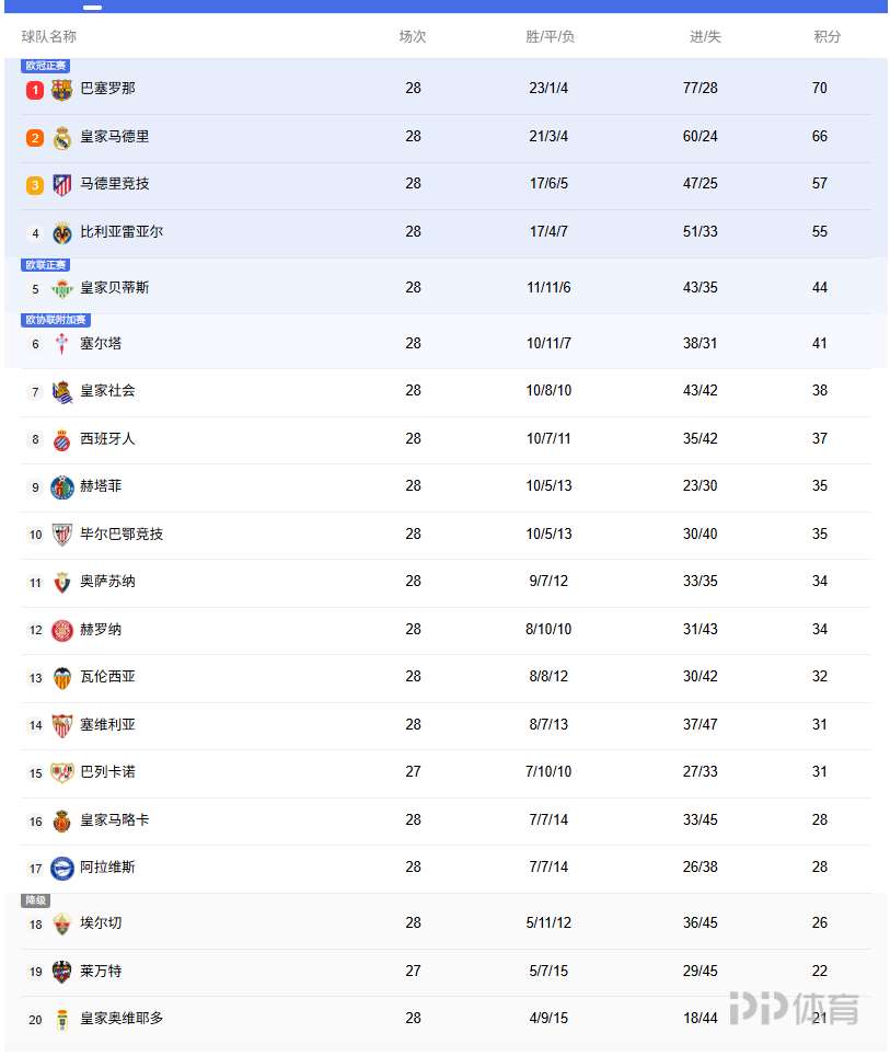 欧战席位争夺激烈,皇家贝蒂斯稳居第五,维戈塞尔塔位列第六,积分差距不大;中游的皇家社会、西班牙人等球队也在积极争取更高排名,力争下赛季获得欧战资格。