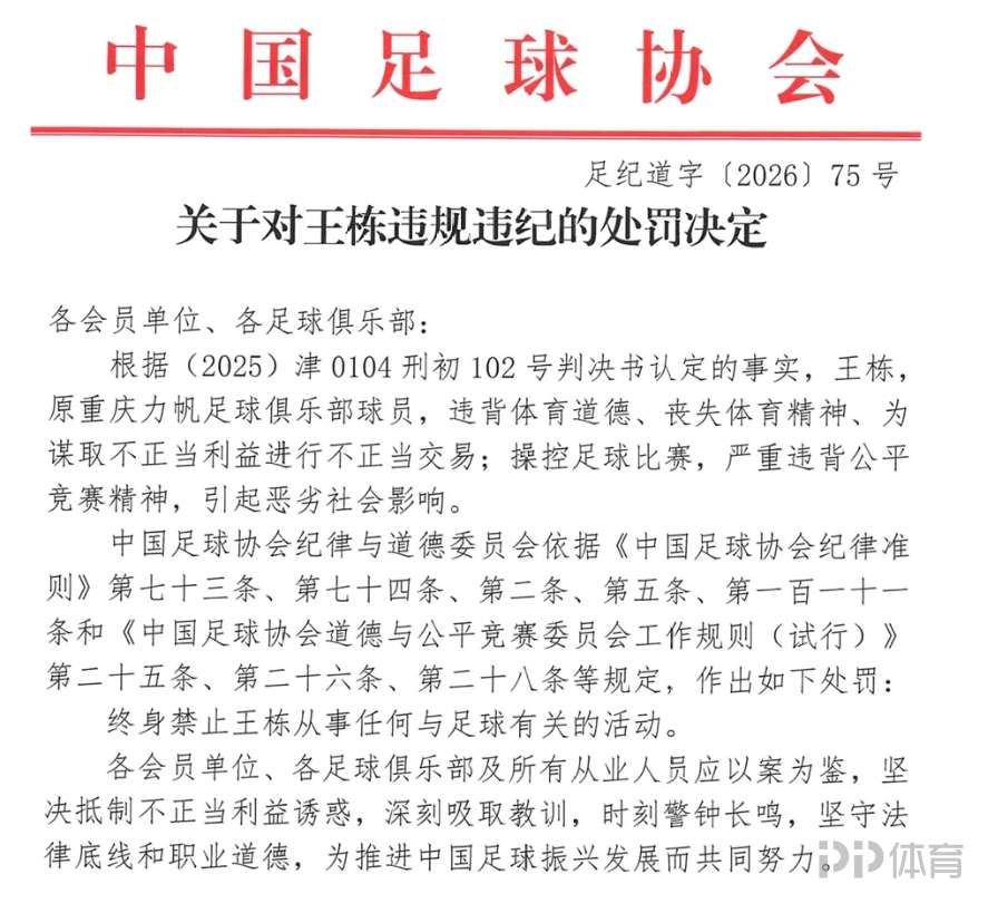 根据罚单内容显示,王栋在效力重庆力帆期间出现不正当交易,被处以终身禁足。