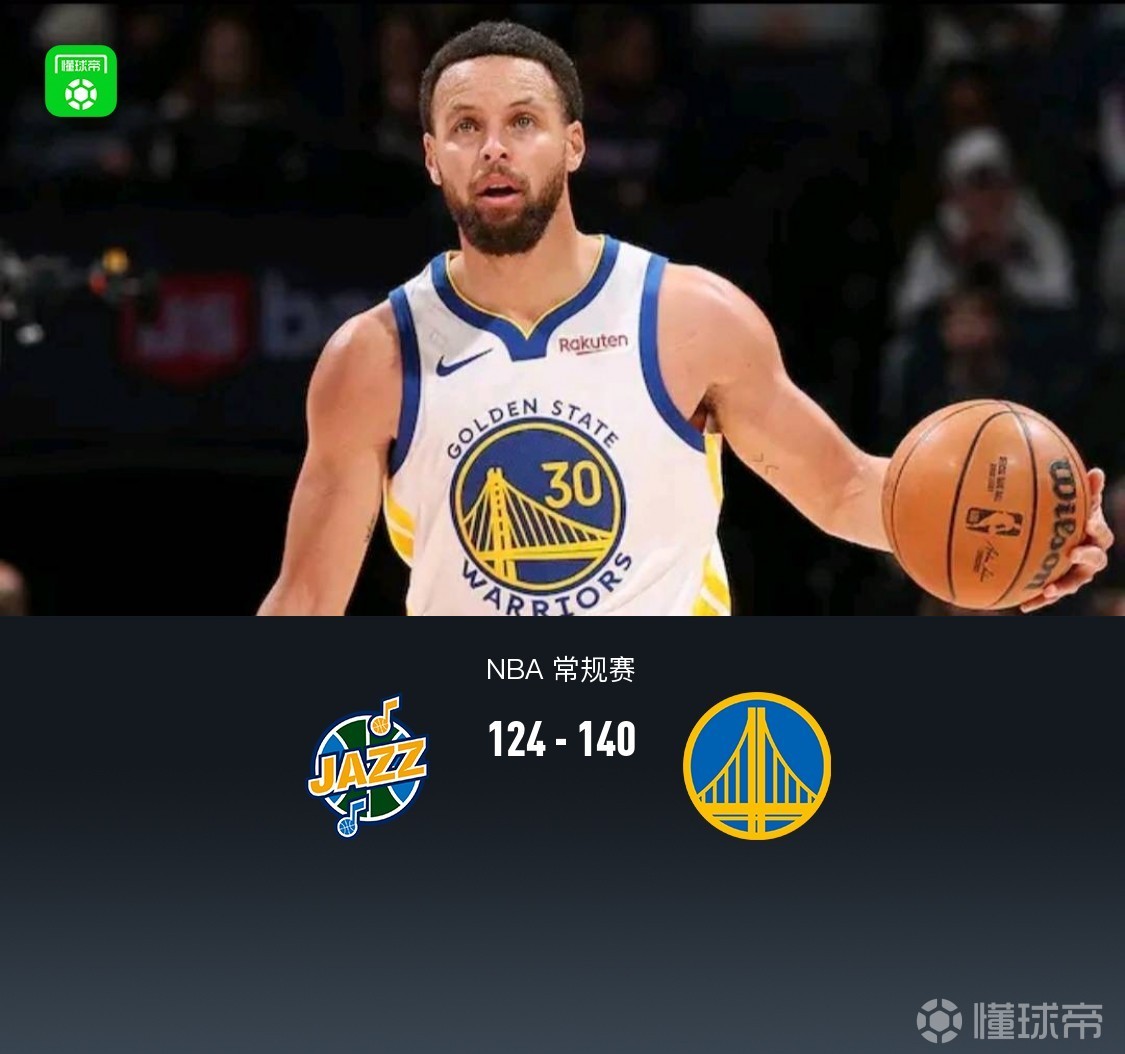 勇士8人上双140-124爵士,库里27分,穆迪26+5,马尔卡宁18分
