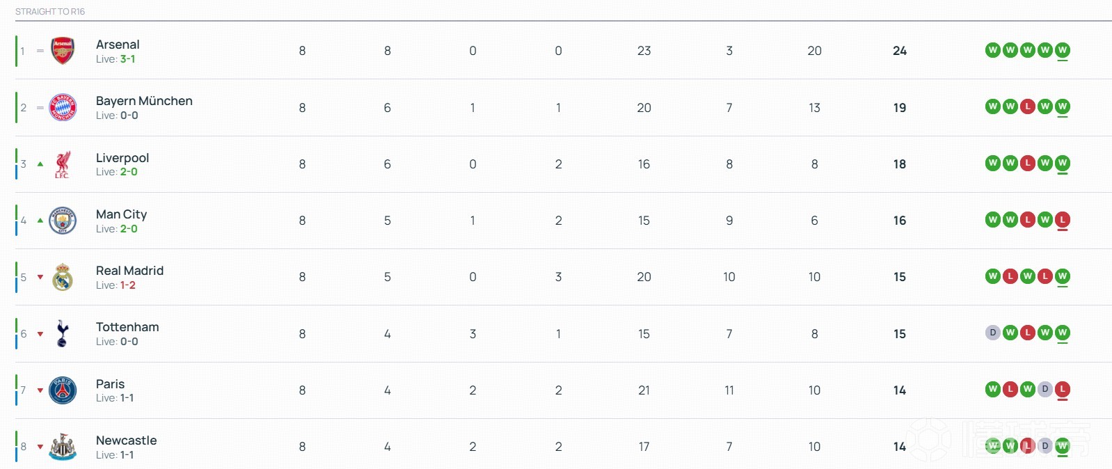 欧冠末轮半场后积分榜:曼城顶替切尔西进入前8,皇马第5巴萨第13